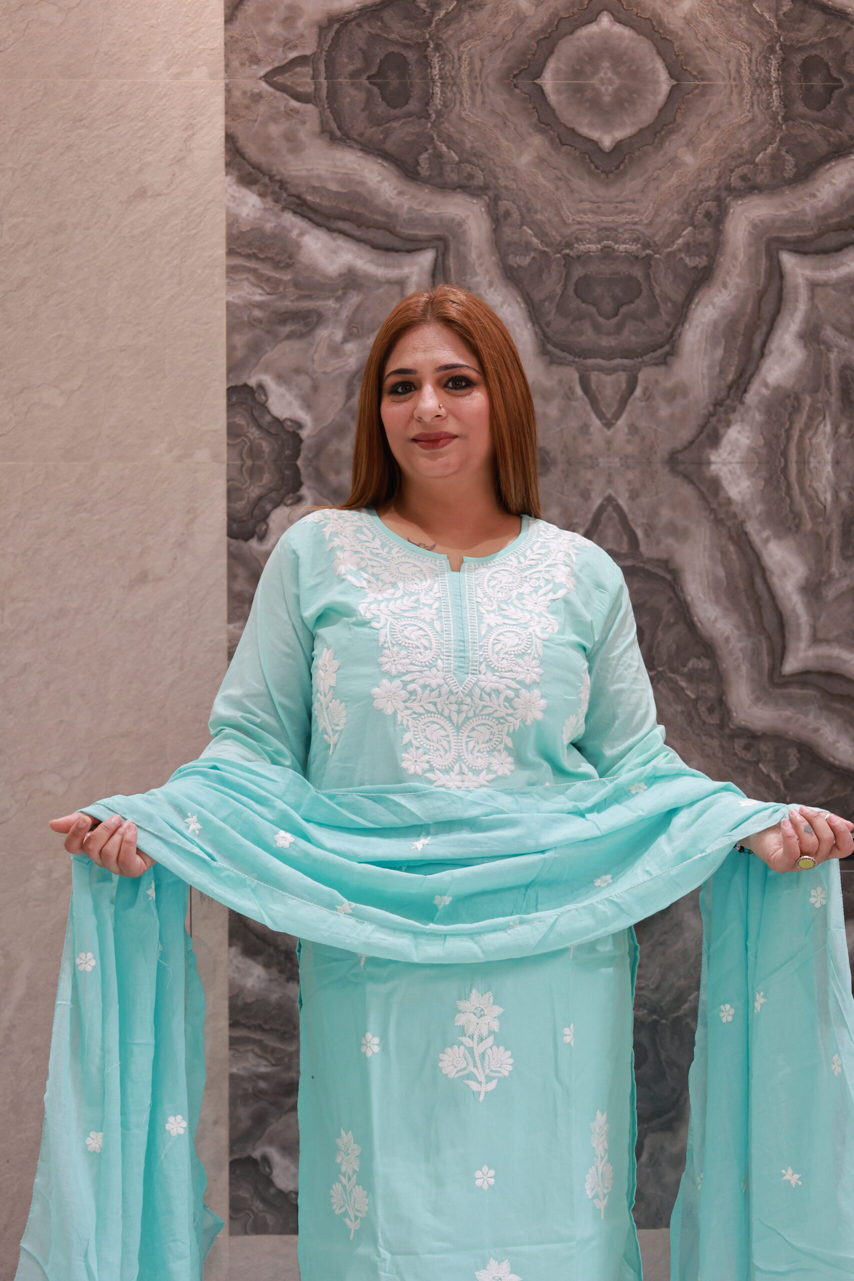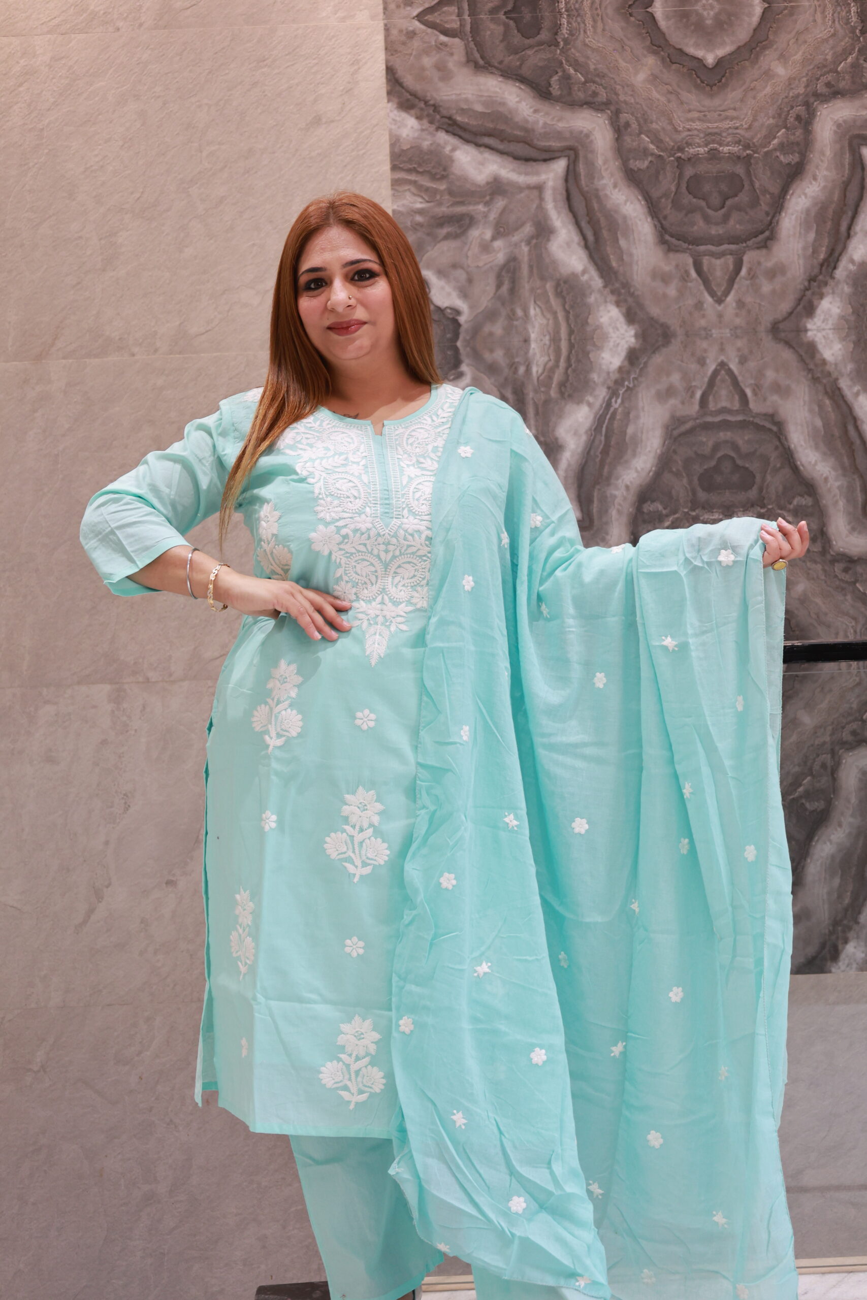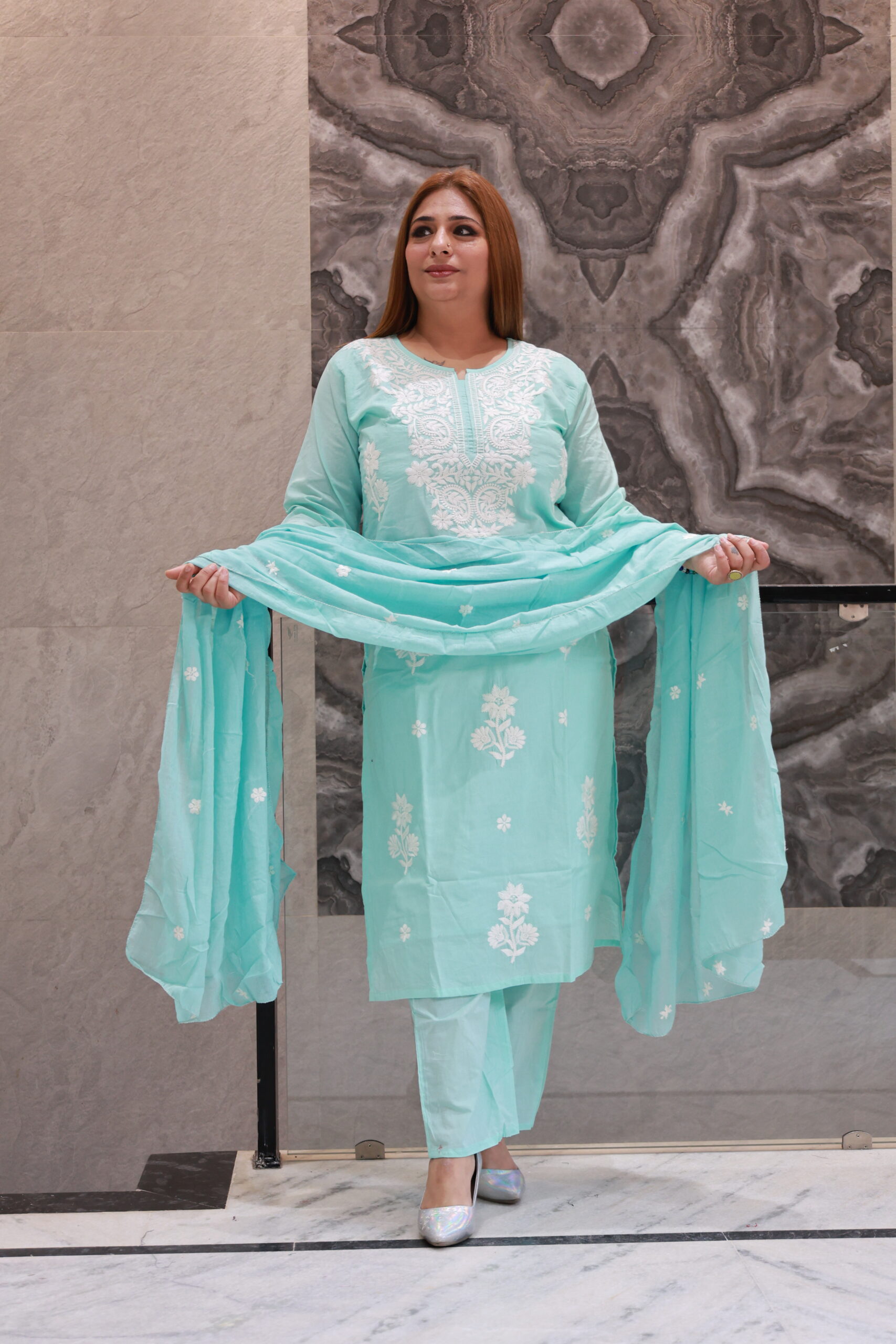 Add a touch of traditional elegance with this Turquoise Cotton Lucknowi Kadai Dress by Balvique. Made from soft and breathable cotton fabric, it offers comfort with graceful style. The beautiful Lucknowi kadai (chikankari-style embroidery) enhances its charm, making it perfect for casual outings, day events, and festive wear. With its elegant design and comfortable fit, this dress is a perfect blend of tradition and modern fashion.